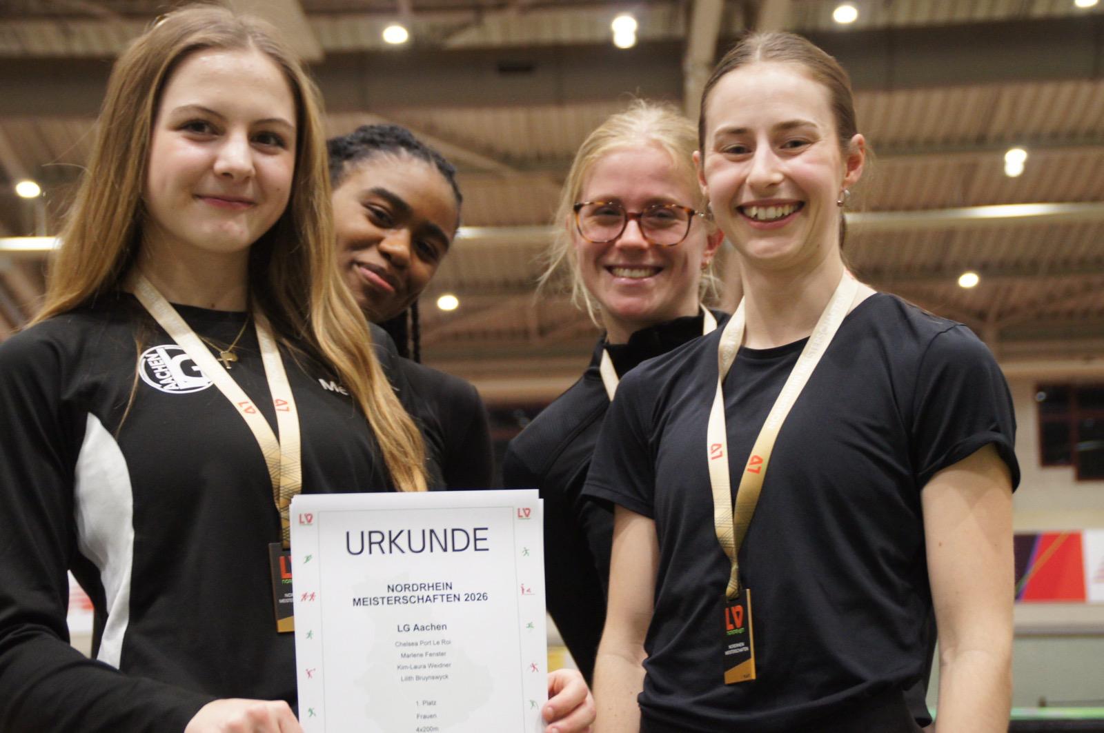 Krönender Abschluss und Highlight aus LG-Sicht bei den Nordrhein-Hallenmeisterschaften in der Leverkusener Leichtathletikhalle war der Auftritt der 4×200m Frauen-Staffel, die in der Besetzung Chelsea Port Le Roi, Marlene Fenster, Kim-Laura Weidner und Lilith Bruynswyck in 1:40,04 min den Nordrhein‑Titel, einen Regionsrekord und die B‑Norm für die Deutschen Meisterschaften erreichte.