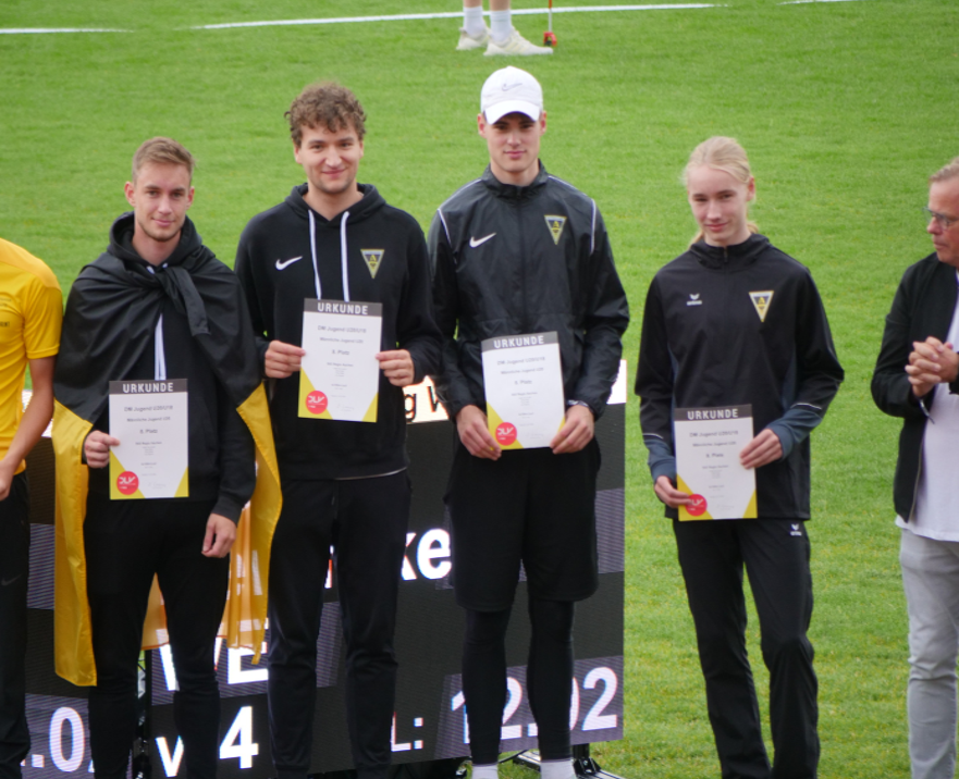 Am Freitag um 15h ging Lasse Laude für den Start der 4x100m Staffel in den Block. Nach einer unberechtigten Disqualifikation unserer Jungs aufgrund eines Einspruchs und einiger Verwirrung belegten sie mit einer neuen Bestzeit von 43.11s einen starken 8.Platz. Lasse Laude, Sören Reul, Timon Blatt und Levi Sacher nahmen somit an der Siegerehrung teil.