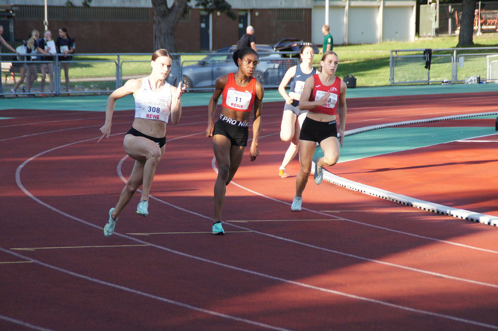 Ungewohnt spät im Jahr fanden offene Nordrheinmeisterschaften der Männer/Frauen und der U14 am 19.8. Im Essener Hallo-Stadion statt. Natürlich haben schon einige der erwachsenen Athletinnen und Athleten ihre Saison beendet, aber durch die Öffnung der Wettbewerbe auch für jüngere Athleten und den für Nordrheinmeisterschaften inzwischen üblichen Wegfall von Qualifikationsnormen (ersetzt durch Teilnehmerhöchstgrenzen) waren fast alle Disziplinen gut besetzt. Chelsea Port Le Roi (Jg.2003) hat eine fantastische Saison hinter sich – Ende Juni konnte sie in Köln sensationell ihre Bestleistung über 100m mit 11,97s erstmals unter die magische 12s-Grenze bringen, Ende Mai war sie über die doppelte Distanz mit 24,95s zum ersten Mal unter 25s geblieben. Ihr Saisonhöhepunkt war die U23-DM in Göttingen Anfang Juli, bei der sie über 100m bis in den Zwischenlauf lief und über 200m erneut unter 25s blieb, was ihr Platz 10 einbrachte. Für die nun abschließenden Nordrheinmeisterschaften hatte sie sich noch einmal für den letzten Wettbewerb der Veranstaltung, die 200m, entschieden und rangierte mit 6/10- Sekunden Abstand auf Rang 2 der Meldeliste. Couragiert hielt sich Chelsea 180m hinter der führenden Meldelisten-Ersten – um dann an dieser vorbei zu ziehen und mit 24,99s Nordrheinmeisterin 2023 zu werden ! Klasse, Chelsea – du hast dich selber für die tolle Saison belohnt ! Wir freuen uns auf 2024 !