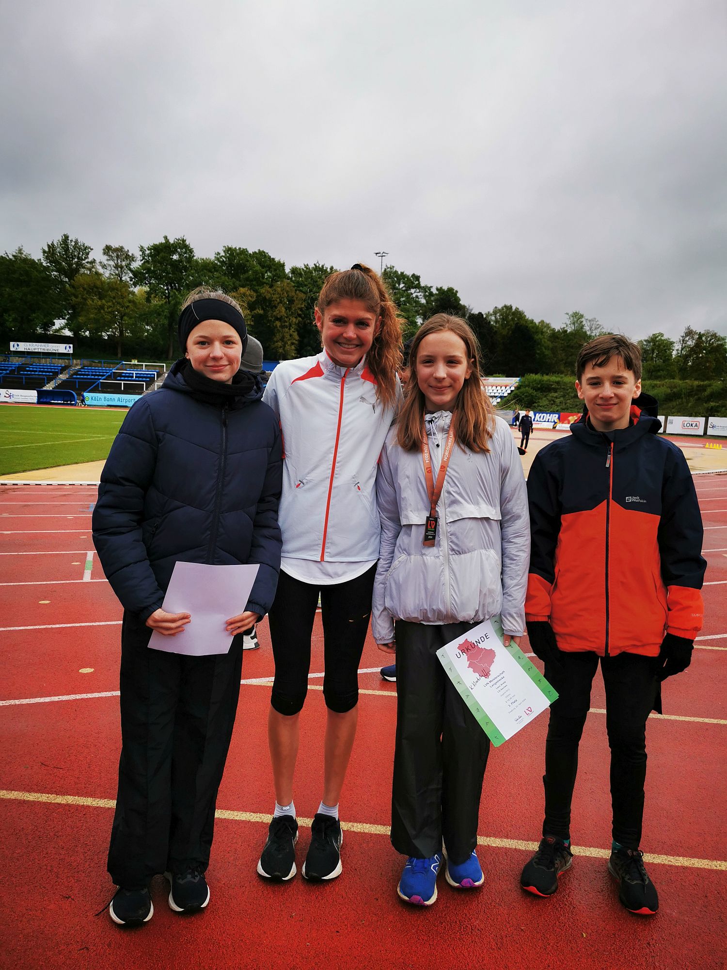 Mit einer starken Ausbeute von zwei Bronzemedaillen und einem fünften Platz sind unsere beiden Langstreckenathletinnen Leni Aretz (W12) und Jule Nawrocki (W13) sowie unser Langstreckenathlet Oskar Stanek (M12) in die Freiluftsaison gestartet. Bei fast winterlichen Temperaturen und typischem Aprilwetter wagten sich Leni, Jule und Oskar am Samstag in Siegburg bei ihrem ersten Bahnrennen diese Saison direkt auf die Langstrecke. Bei den Nordrhein Langstreckenmeisterschaften hieß dies für die jüngsten Starterinnen und Starter der U14 die Distanz von 2.000 m, also fünf Stadionrunden, zurückzulegen. Bereits im ersten Rennen des Tages waren Leni und Jule am Start. Trotz großem Respekt vor der ungewohnt langen Strecke und etwas Nervosität zeigten die beiden Läuferinnen einen guten Wettkampf. Dabei konnte Leni in ihrer Altersklasse W12 in einer Zeit von 8:18,48 min. als 3. einen Podestplatz erlaufen und sich bei ihren ersten LVN Meisterschaften direkt über die Bronzemedaille freuen. Jule war in ihrem allerersten 2.000 m Lauf überhaupt etwas schneller unterwegs und konnte mit 7:55,64 min. direkt die 8-Minuten Schallmauer durchbrechen, was ihr einen tollen 5. Platz in ihrer Altersklasse W13 einbrachte.