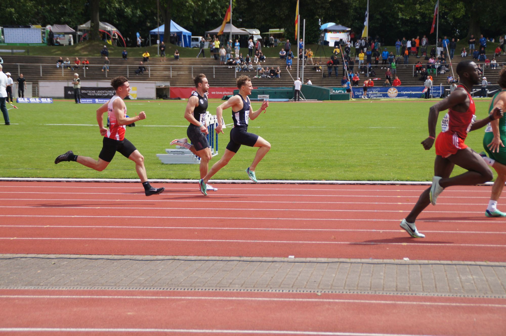 Leider hatte Mateusz langer Schritt am Ende seines Laufs zur Folge, dass er mit Schmerzen in der Leistengegend von der Bahn kam. Mehr als unglücklich, wenn man bedenkt, dass er nur 40 Minuten später schon wieder in den Callroom für seinen 400m Hürden Vorlauf musste. Es gab also kaum Zeit zu regenerieren und auch wenn sich alle Beteiligten große Mühe gaben, so war schon bald abzusehen, dass Mateusz nicht schmerzfrei laufen konnte und damit ein Start leider aussichtslos war. Schweren Herzens wurde also der Start zurückgezogen und die Läufe von der Tribüne verfolgt. Die gezeigten Leistungen seiner Mitstreiter trösteten ihn nicht, wohl aber die Gewissheit, dass Mateusz auch im kommenden Jahr noch der U23 Klasse angehört und dann, gemeinsam mit seinen Staffelkollegen, erneut beweisen kann, was in ihm steckt.