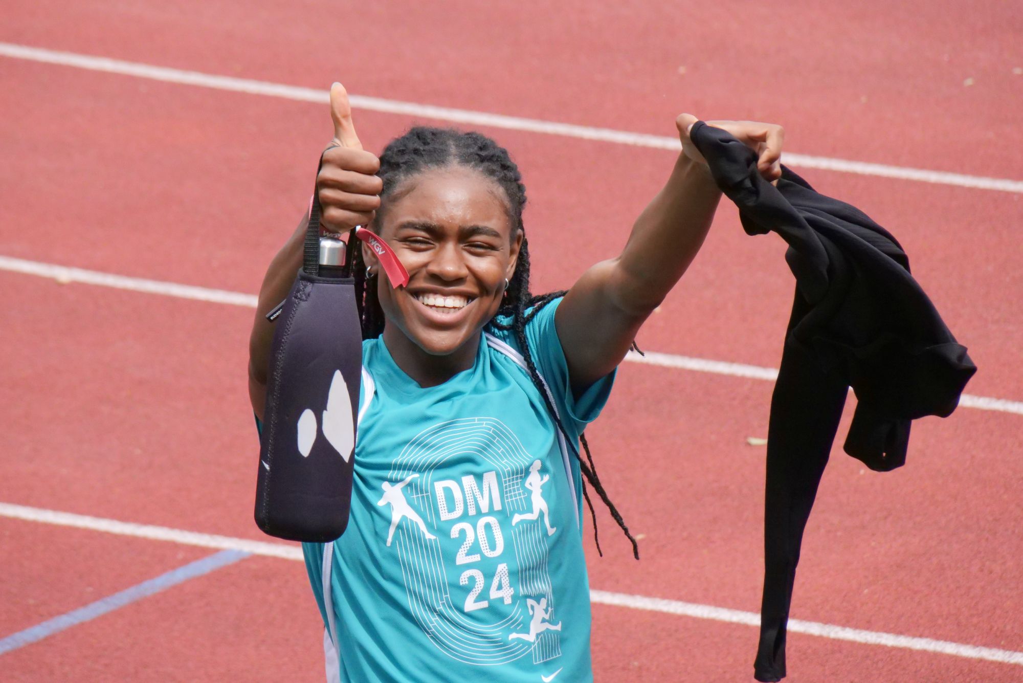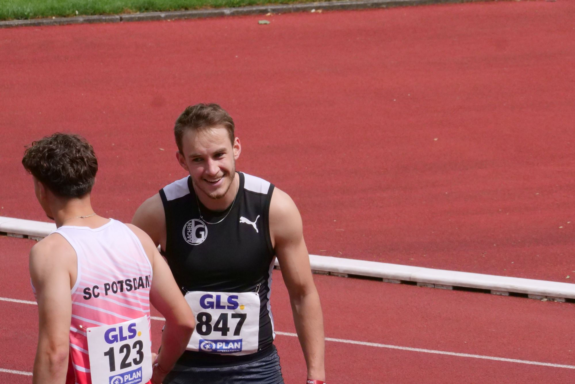 Zunächst ging es für unsere Herren Mateusz und Levi auf die Langsprintstrecke über 200m. Mateusz verkraftete seine verletzungsbedingte Absage am Freitagabend überraschend gut und zeigte sich hochmotiviert. Auch den Samstag nutzte er für weitere Physiotherapie-Behandlungen und leichtes Training. Nachdem er am Sonntagmorgen die Startfreigabe von der Physiotherapeutin seines Vertrauens, Dagmar Kondziella bekommen hatte, ging es für ihn in Lauf 4 auf Bahn 3 an den Start. Er zeigte ein solides Rennen und das allerwichtigste war, dass er mit einem erhobenen Daumen im Zielbereich signalisierte, dass er schmerzfrei und zufrieden war. Seine Zeit von 22,01 Sekunden stellte ihn zwar nicht vollends zufrieden, jedoch lagen alle Läufer in diesem Lauf mehrere Zehntel oberhalb ihrer Bestzeit, was die Beteiligten mit starken Gegenwind begründeten.